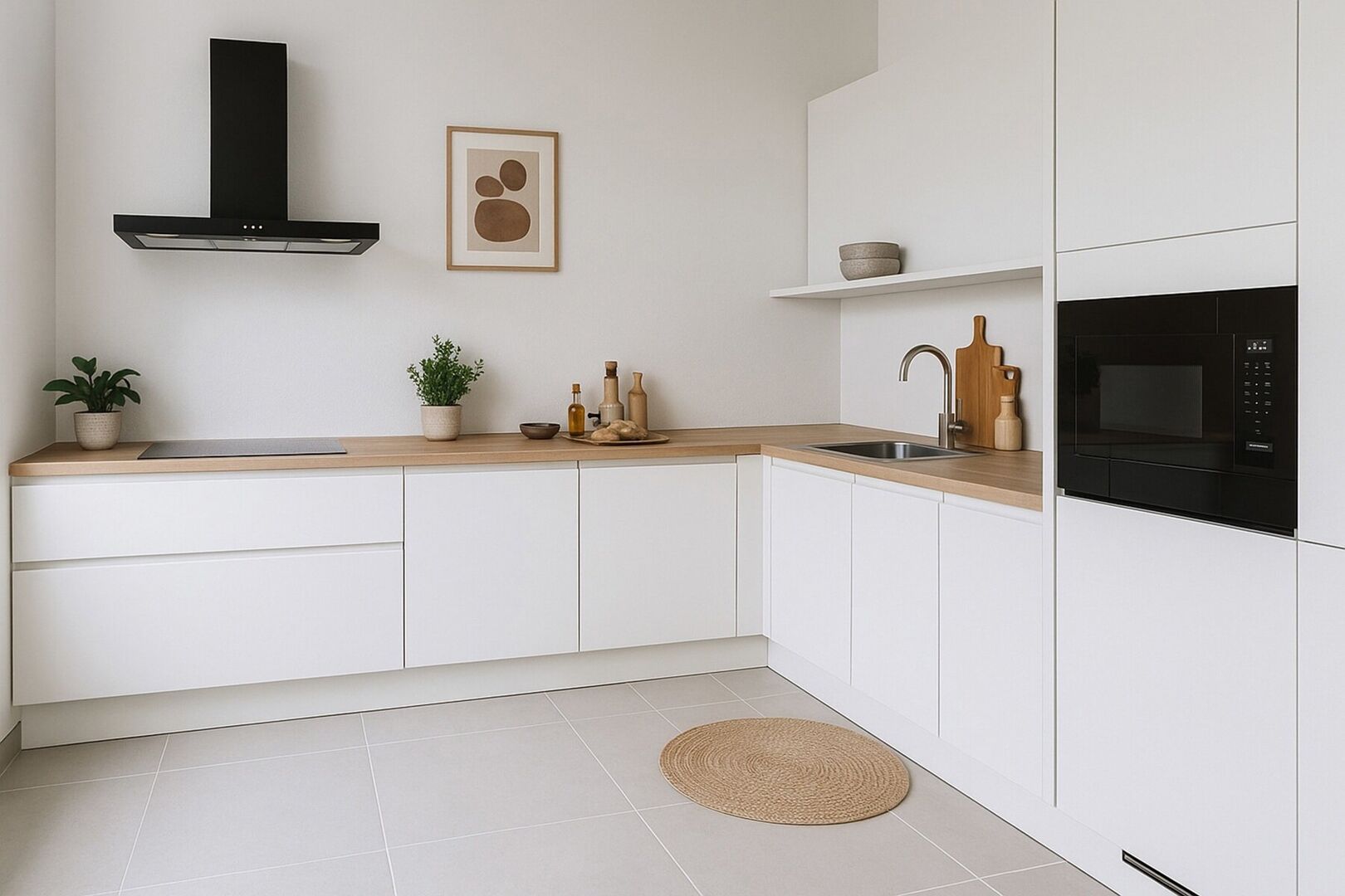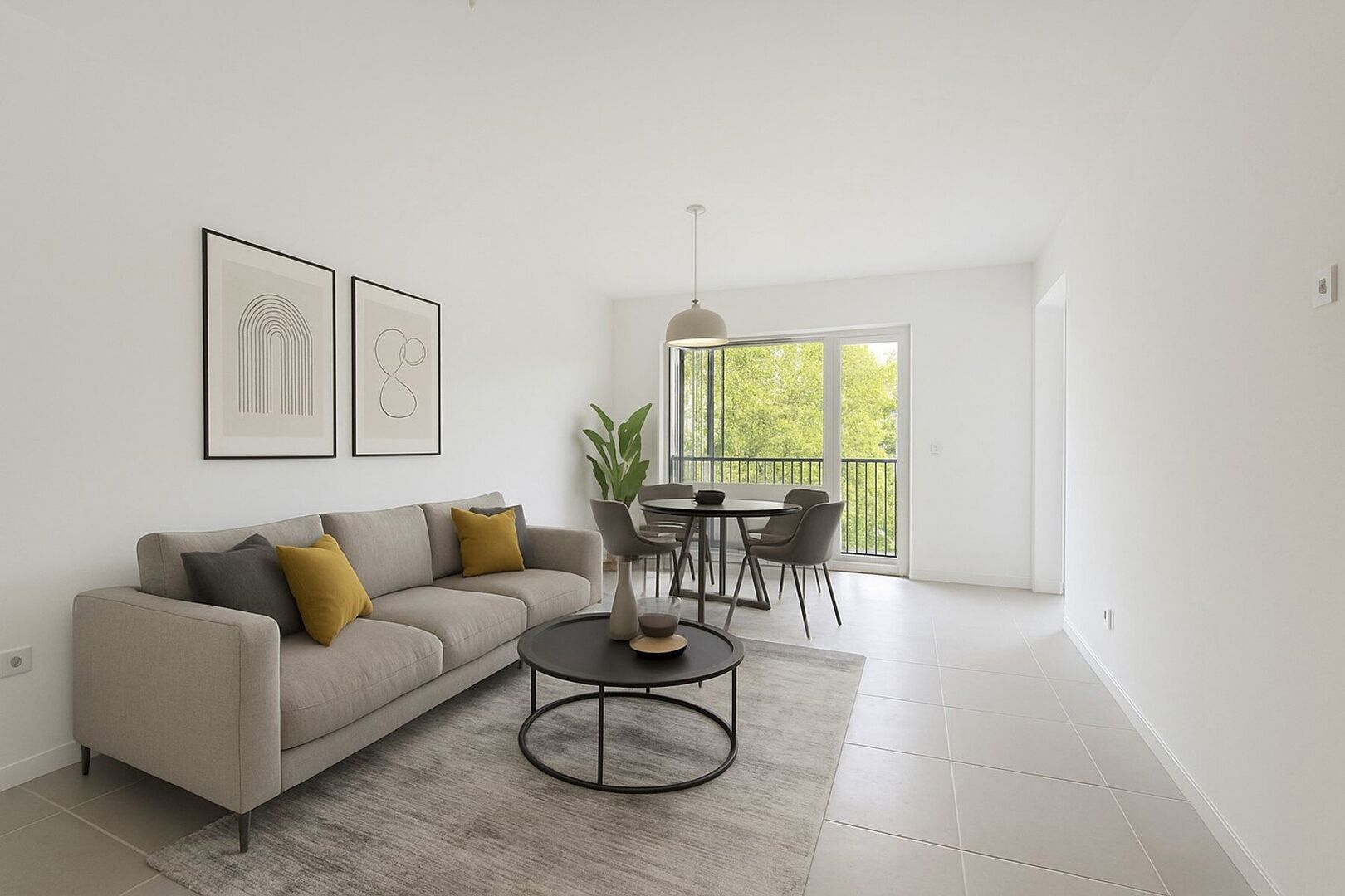 Bij het binnenkomen treft u een ruime inkomhal met apart toilet en vestiairemogelijkheid. De lichtrijke leefruimte (ca. 30 m²) is afgewerkt met een kwalitatieve keramische tegelvloer en sluit naadloos aan op de halfopen, luxueus ingerichte keuken (ca. 11 m²) met natuurstenen werkblad.