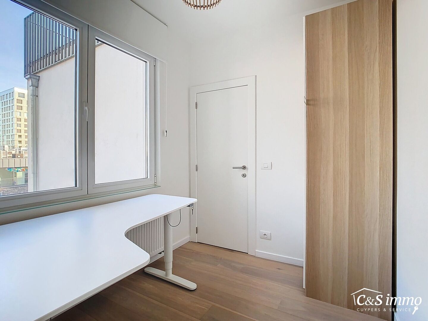 Hedendaags volledig gerenoveerd appartement (ca 75m²) met frontaal uitzicht op de Schelde in een monumentaal gebouw op het Eilandje. Woon- en eetkamer (ca. 30m²) op parket met open ingerichte keuken met eiland voorzien van kookplaat, dampkap, combi oven, vaatwasmachine en koelkast met vriezer. Een prachtig uitzicht over de Schelde door de brede en hoge raampartijen. Vanuit de woonkamer en keuken toegang tot het overdekt terras aan de voorzijde (ca 5m²). 2 Slaapkamers (ca. 7-14m²) op parket. Ingerichte badkamer voorzien van een douche, dubbel wasmeubel & toilet. Berging met aansluiting voor wasmachine. Een kleinschalig gebouw met goede isolatie, lift en individuele meters. Elk appartement heeft een privatieve kelderberging.