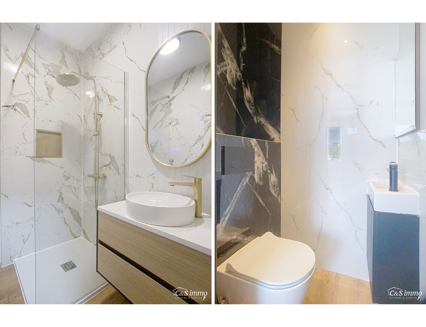Via de ruime inkomhal (ca. 6 m²) met ingemaakte kasten en parketvloer betreedt u het appartement. De lichtrijke leefruimte (ca. 31 m²) aan de voorzijde biedt een open en luchtig gevoel, dankzij grote raampartijen en een stijlvol afgewerkte open keuken. De keuken is volledig uitgerust met nieuwe toestellen: een oven, inductiekookplaat, dampkap, vaatwasser en een koelkast met vriezer – alles voorzien voor modern comfort. Het appartement beschikt over twee ruime slaapkamers (ca. 16 m² en 11 m²). Vanuit de grootste slaapkamer heeft u toegang tot het aangename terras (ca. 5 m²), waar u in alle rust kan genieten van de avondzon en een open uitzicht. De moderne badkamer (ca. 4 m²) is uitgerust met een inloopdouche en een lavabo. Een apart gastentoilet maakt het geheel compleet.
