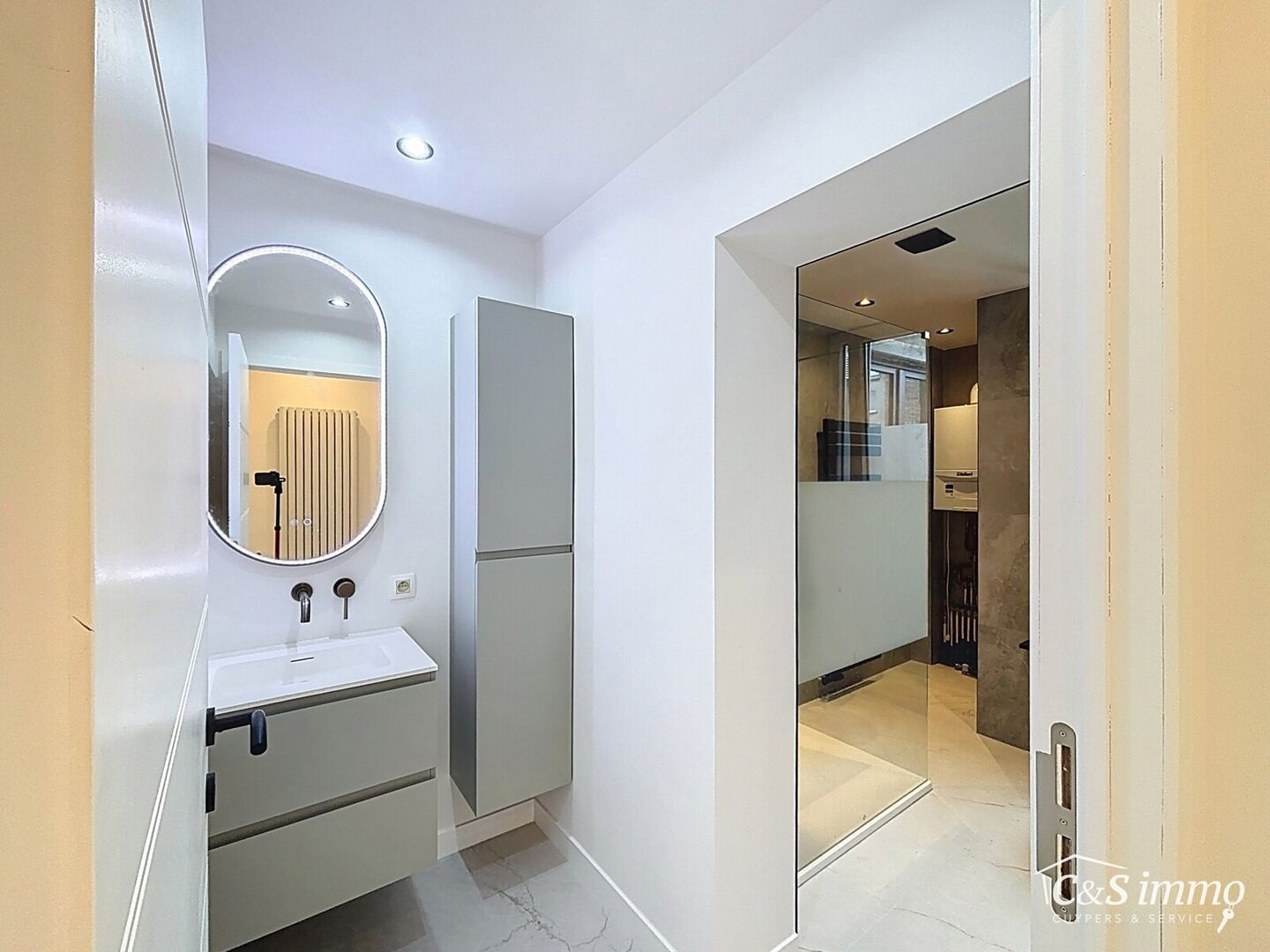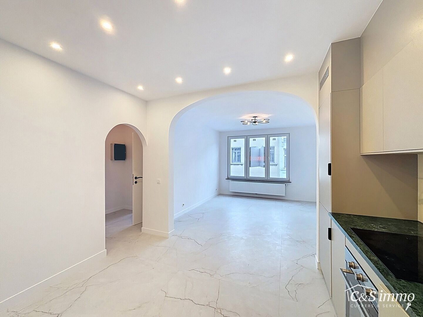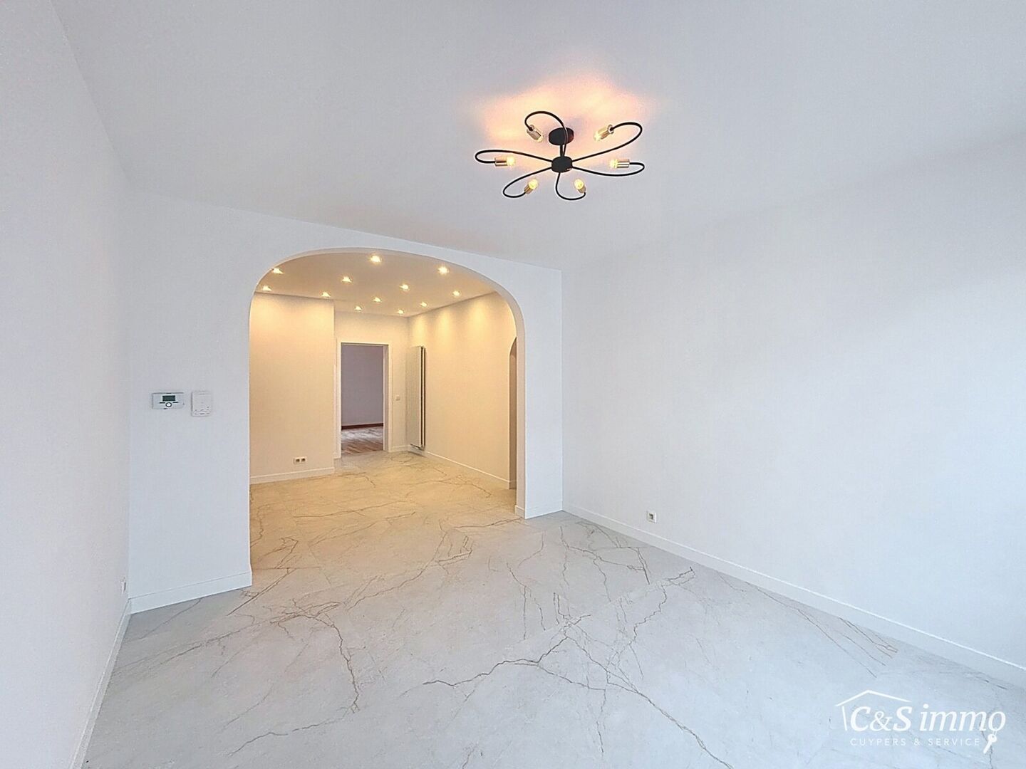 Bij het betreden van dit volledig gerenoveerde appartement wordt u verwelkomd in een stijlvolle inkomhal met een elegante, afgeronde deuropening.