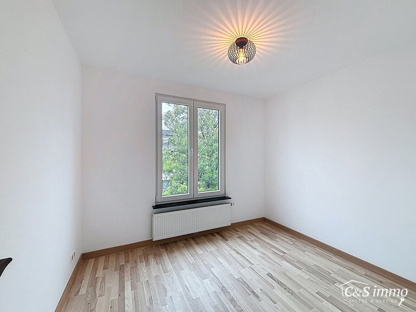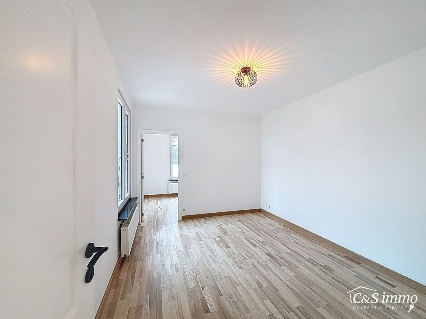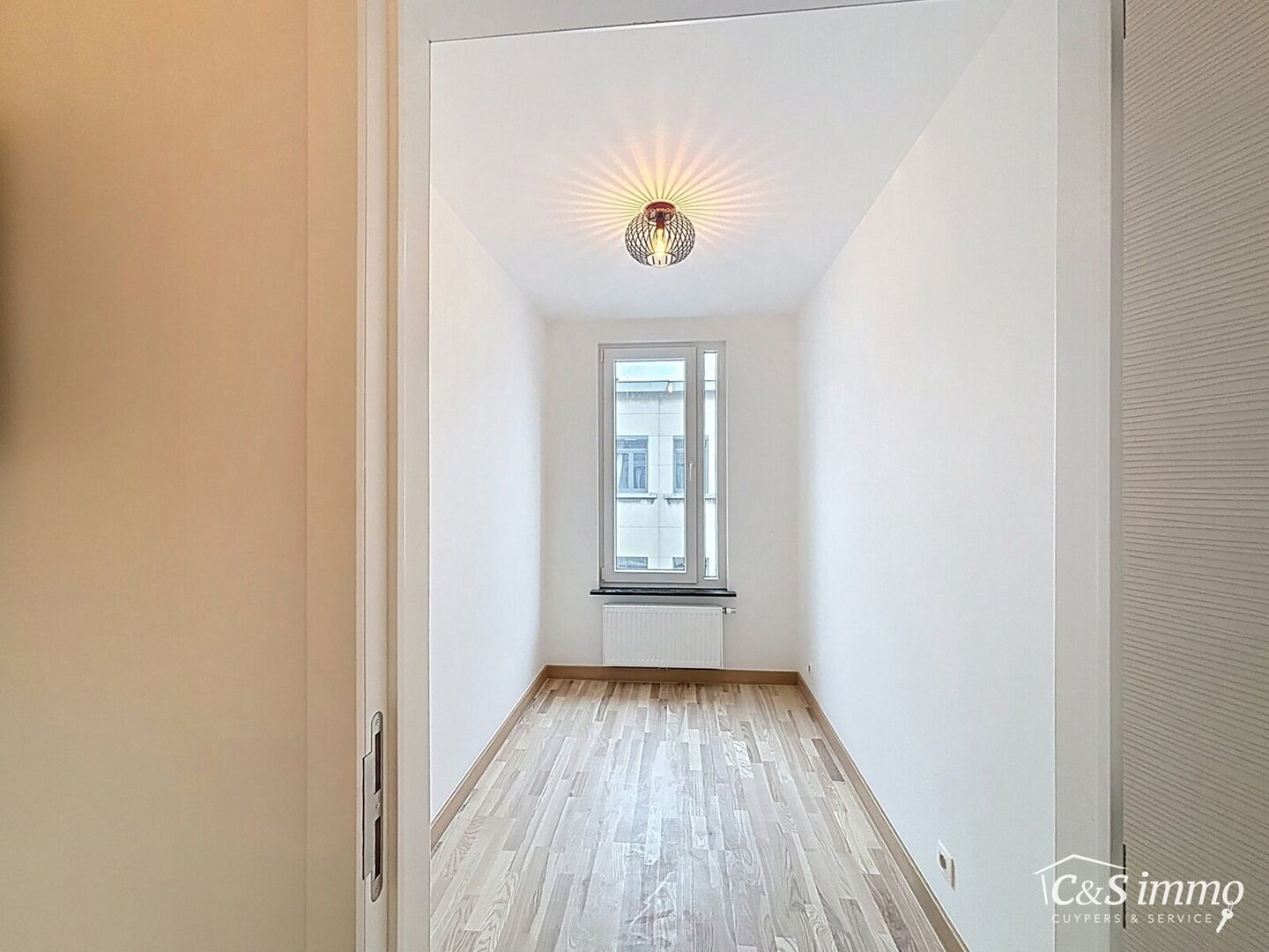 Direct aan de inkom bevindt zich een bureauruimte met parketlaminaat en een gloednieuw raam, ideaal voor thuiswerk of studeerplek.