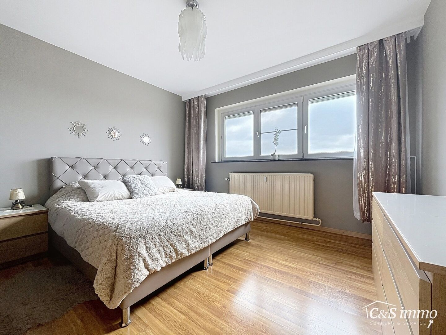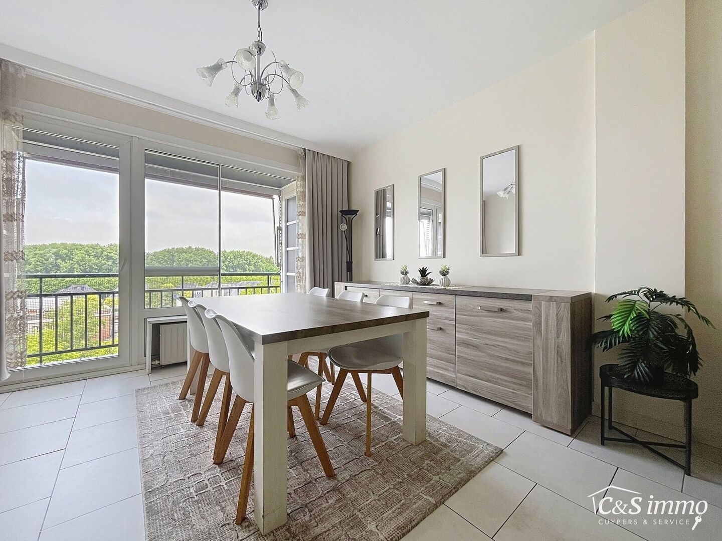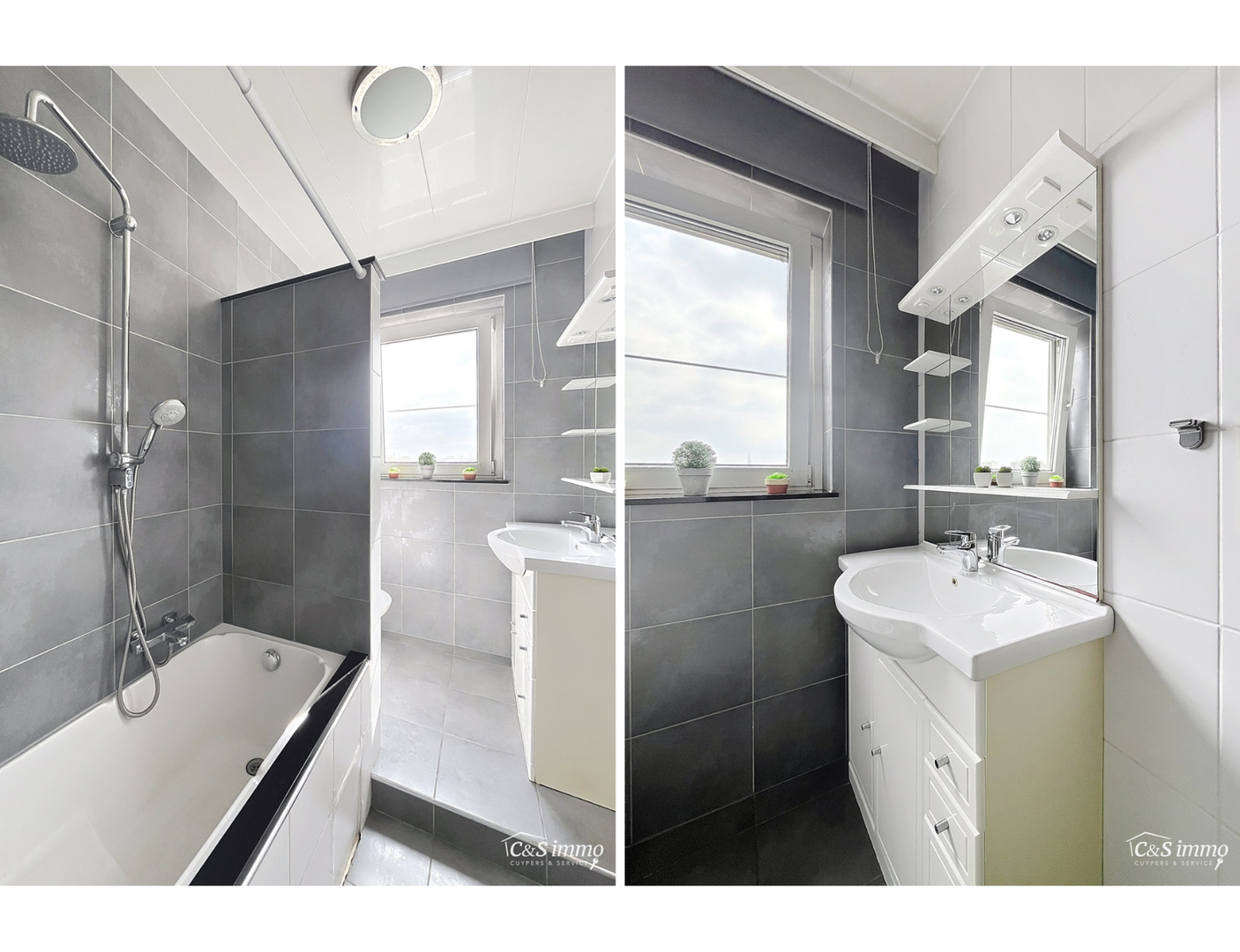 Lichtrijk appartement op de 6e verdieping met een aangenaam en open uitzicht. Bij het binnenkomen van dit appartement betreedt u de inkomhal (ca5 m²), uitgerust met praktische ingebouwde kasten. De woonkamer (ca. 28 m²) is voorzien van een onderhoudsvriendelijke tegelvloer en geniet veel natuurlijk licht dankzij de grote raampartijen, die toegang geven tot het zonnige terras (4 m²). Het terras is uitgerust met een dubbele bergkast en een vrolijke zonneluifel. Ingerichte keuken (ca.6 m²) met koelkast, vaatwasser, inductiekookplaat, dampkap, combi-oven en een aansluiting voor een wasmachine. De twee slaapkamers (ca.15 m² en 10 m²) zijn voorzien van automatische rolluiken. De badkamer (4 m²) is uitgerust met een wc, een keramisch lavabomeubel en een ruime bad/douchecombinatie.