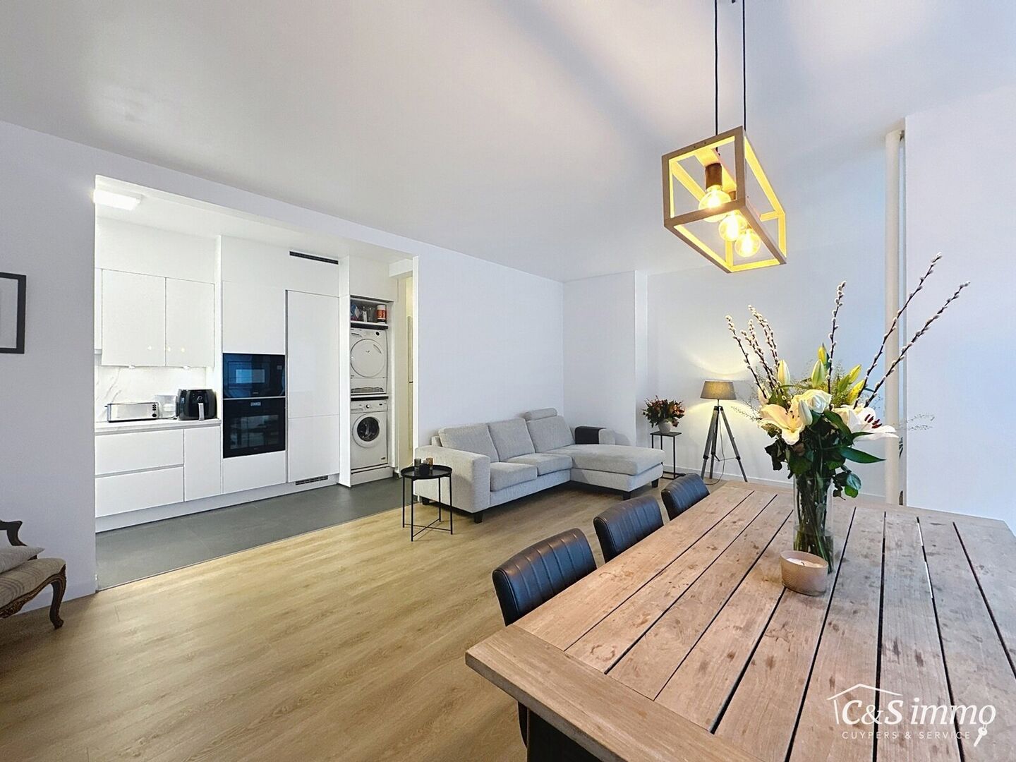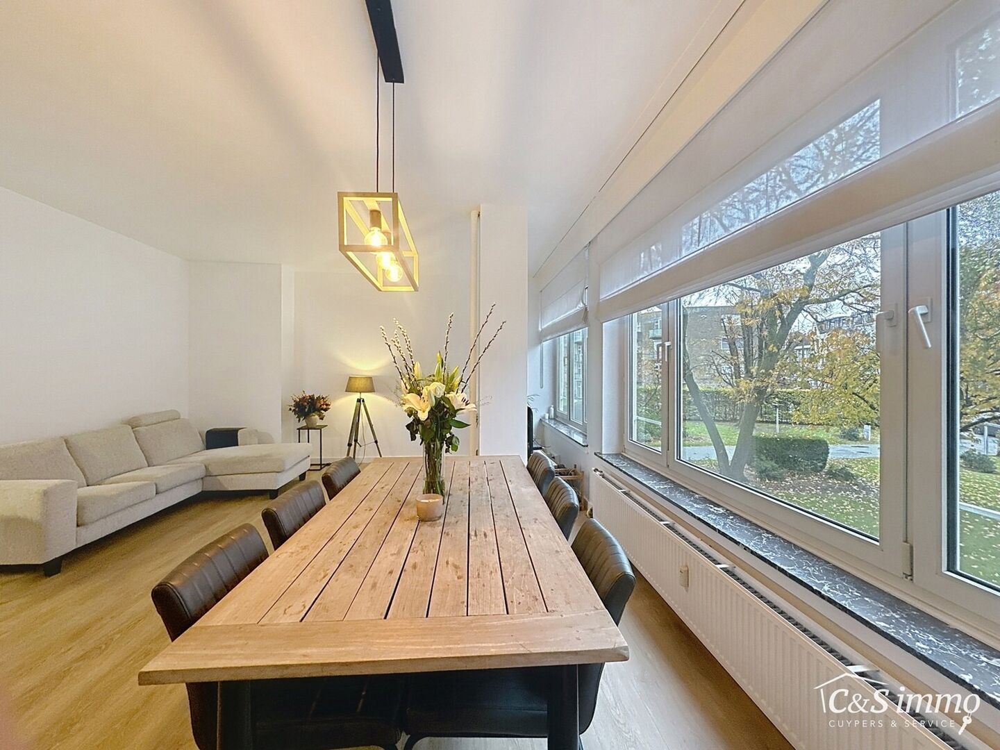 De grote leefruimte op parket sluit naadloos aan op de volledig ingerichte keuken, uitgerust met stoomoven, microgolf, inductiekookplaat, vaatwasser en ijskast met vriesvak — ideaal voor wie graag kookt en gasten ontvangt.