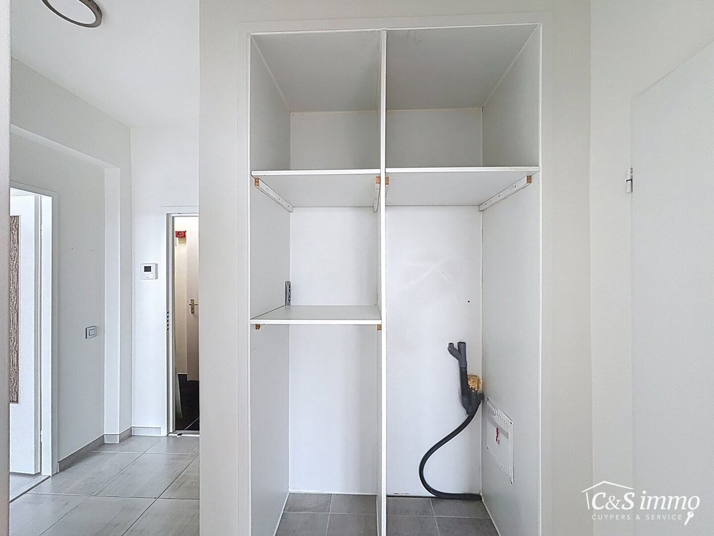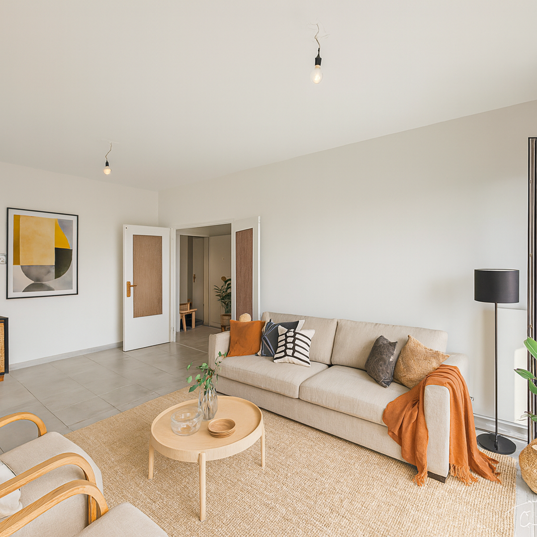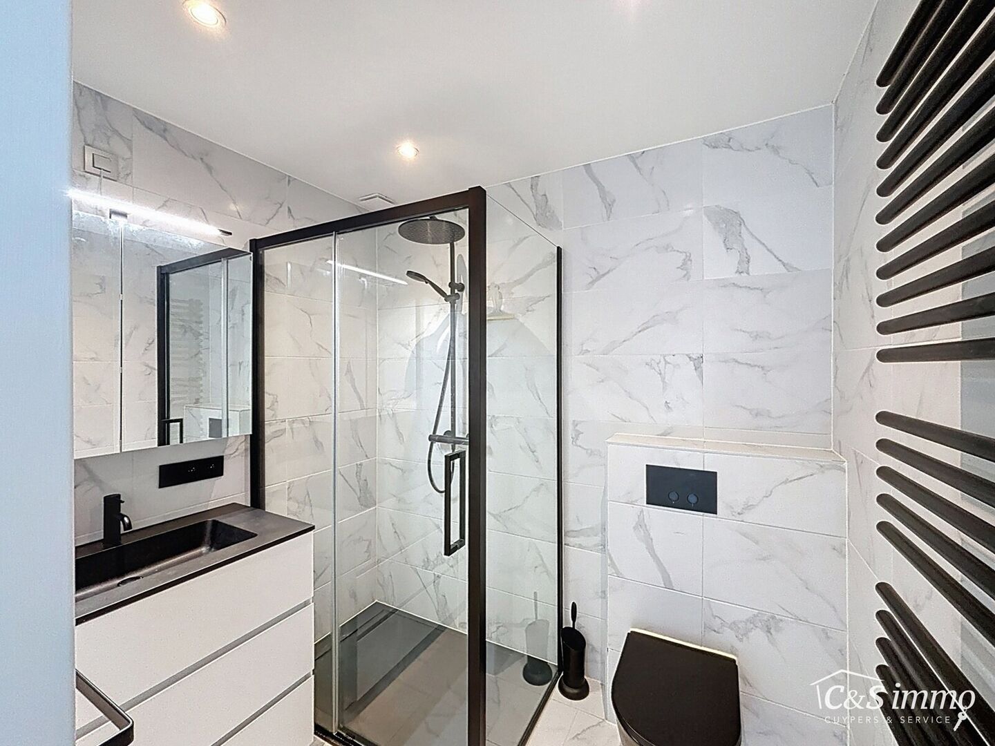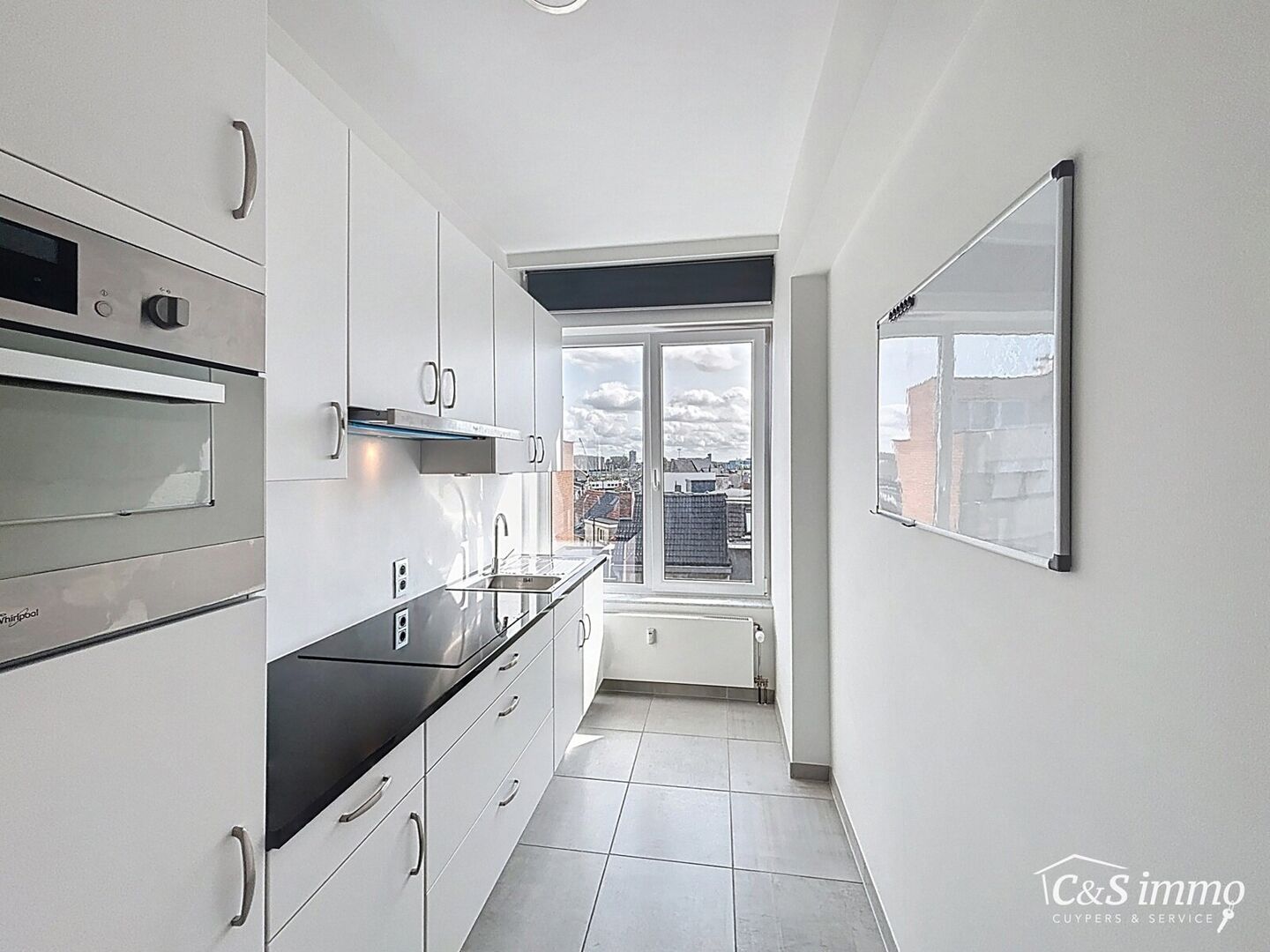 De volledig vernieuwde keuken (ca. 10 m²) is uitgerust met een combi-oven, inductiekookplaat en tal van opberglades. De ruime slaapkamer (ca. 15 m²) op parketvloer werd voorzien van nieuwe ramen. De moderne badkamer is volledig vernieuwd en ingericht met een hangtoilet, inloopdouche en stijlvol badkamermeubel.