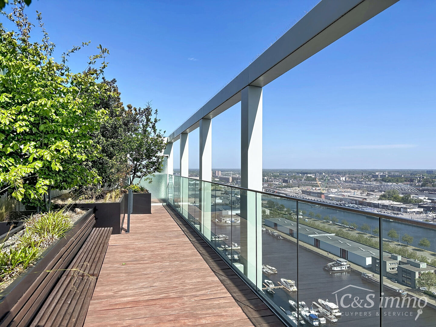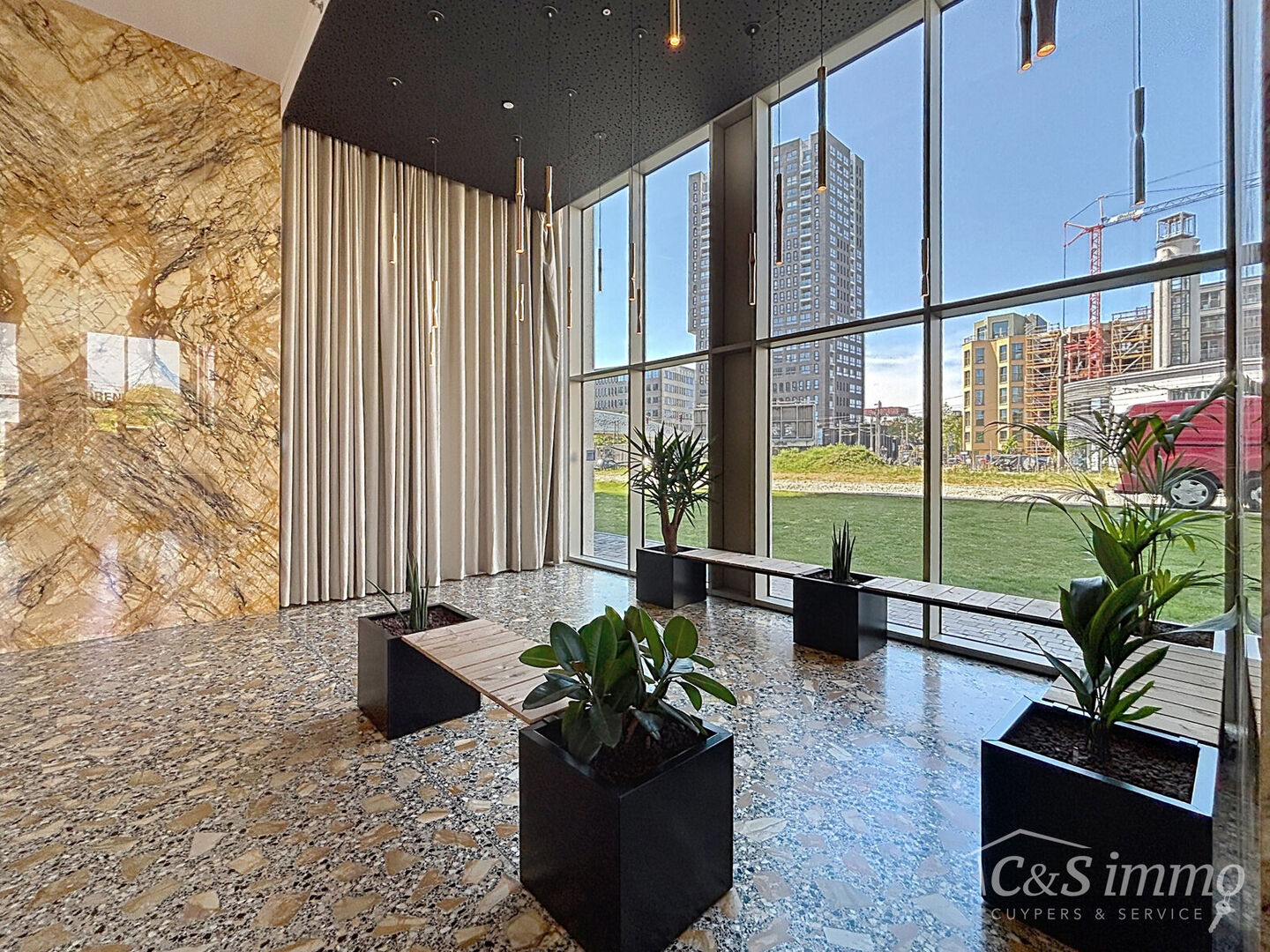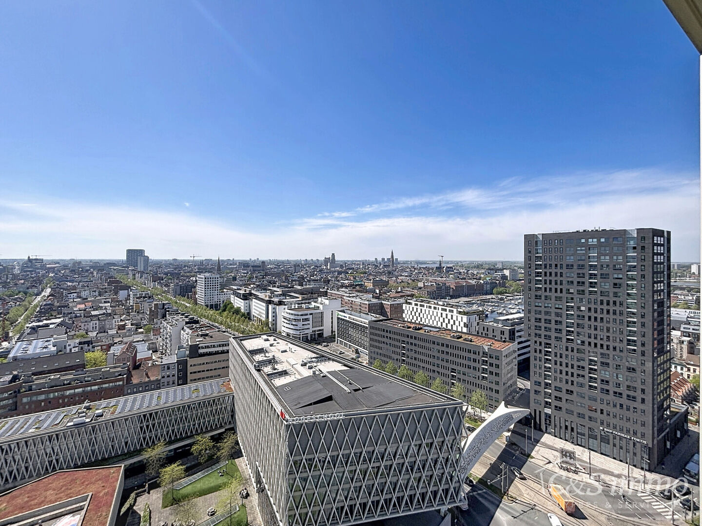 Luxe nieuwbouw appartement op de 20e verdieping met 270 graden uitzicht over Antwerpen, Park Spoor Noord, het Eilandje en de dokken. De lichtrijke leefruimte (ca. 26 m²) met open keuken (ca. 6 m²) is voorzien van een keramische kookplaat, dampkap, koelkast met diepvriesvak, combi-oven en vaatwasser - alle toestellen zijn van Whirlpool. Vanuit de keuken is er toegang tot het terras (ca. 6 m²). U geniet van een ZO zon doorheen het appartement. 2 slaapkamers (ca. 14 - 9 m²). De badkamer (ca. 5 m²) is voorzien van dubbele badkamermeubel, verwarmingselement en inloopdouche. Apart toilet. Berging (ca. 3 m²) met aansluiting voor wasmachine en droogkast. Gemeenschappelijke daktuin op de 23e verdieping van het gebouw. Privatieve meters. Privatieve kelderberging. Gemeenschappelijke fietsenstalling. Pakjesautomaat voorzien. Ondergrondse autostaanplaats aan te kopen aan 35 000 euro.