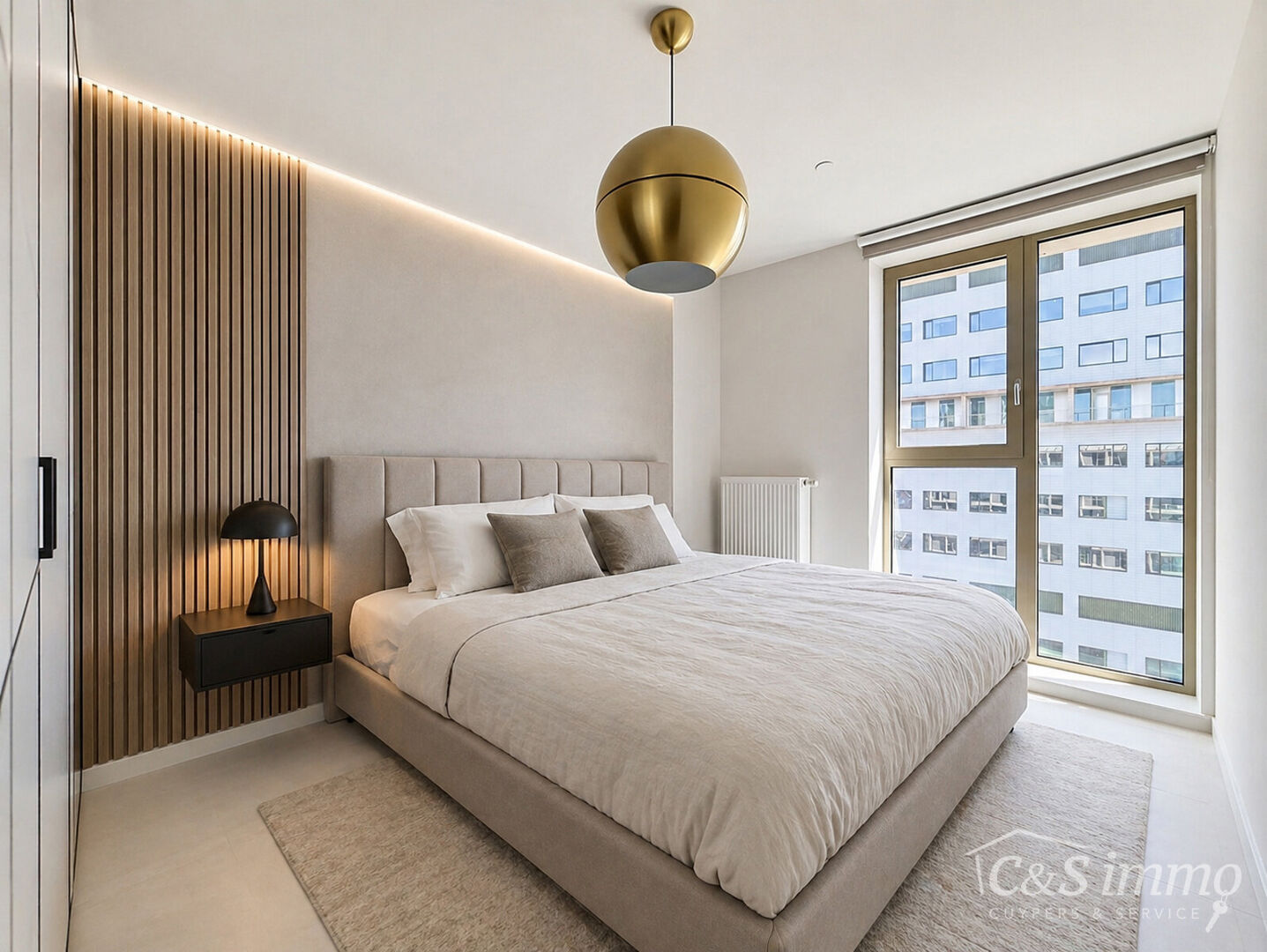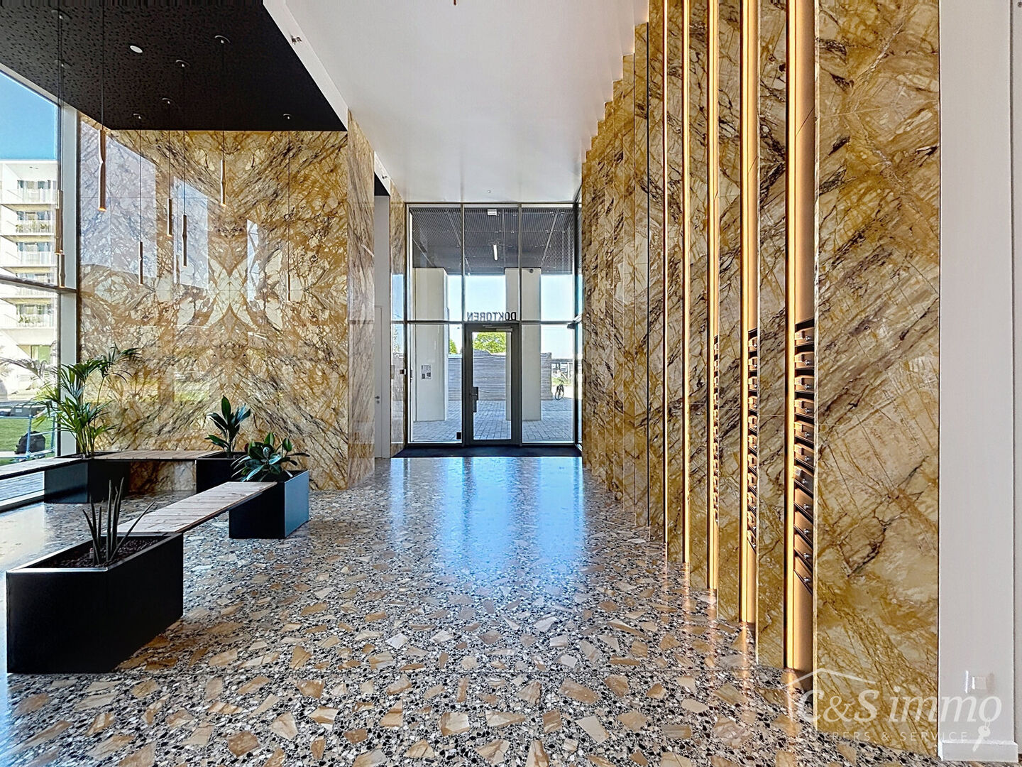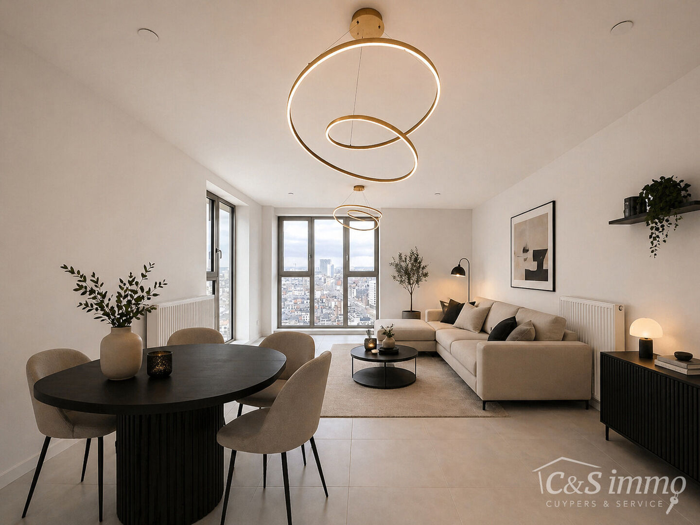 Luxe nieuwbouw appartement op de 20e verdieping met 270 graden uitzicht over Antwerpen, Park Spoor Noord, het Eilandje en de dokken. De lichtrijke leefruimte (ca. 26 m²) met open keuken (ca. 6 m²) is voorzien van een keramische kookplaat, dampkap, koelkast met diepvriesvak, combi-oven en vaatwasser - alle toestellen zijn van Whirlpool. Vanuit de keuken is er toegang tot het terras (ca. 6 m²). U geniet van een ZO zon doorheen het appartement. 2 slaapkamers (ca. 14 - 9 m²). De badkamer (ca. 5 m²) is voorzien van dubbele badkamermeubel, verwarmingselement en inloopdouche. Apart toilet. Berging (ca. 3 m²) met aansluiting voor wasmachine en droogkast. Gemeenschappelijke daktuin op de 23e verdieping van het gebouw. Privatieve meters. Privatieve kelderberging. Gemeenschappelijke fietsenstalling. Pakjesautomaat voorzien. Ondergrondse autostaanplaats aan te kopen aan 35 000 euro.