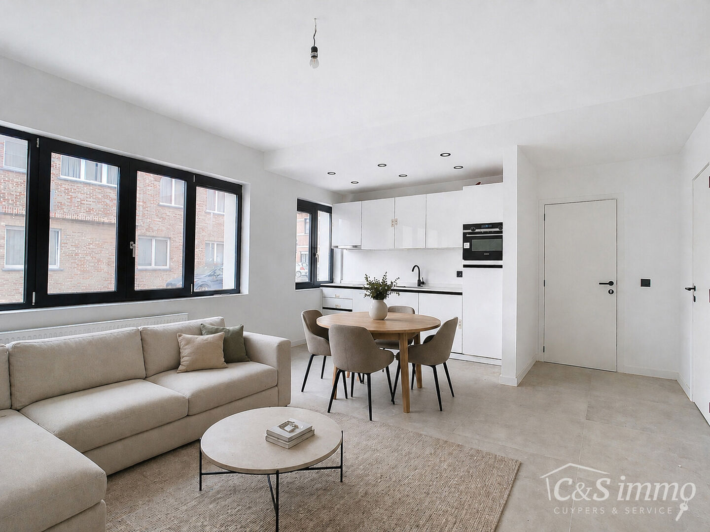 De inkomhal biedt directe toegang tot de moderne open keuken, volledig uitgerust met hoogwaardige Siemens-toestellen — ideaal voor een ochtendkoffie.