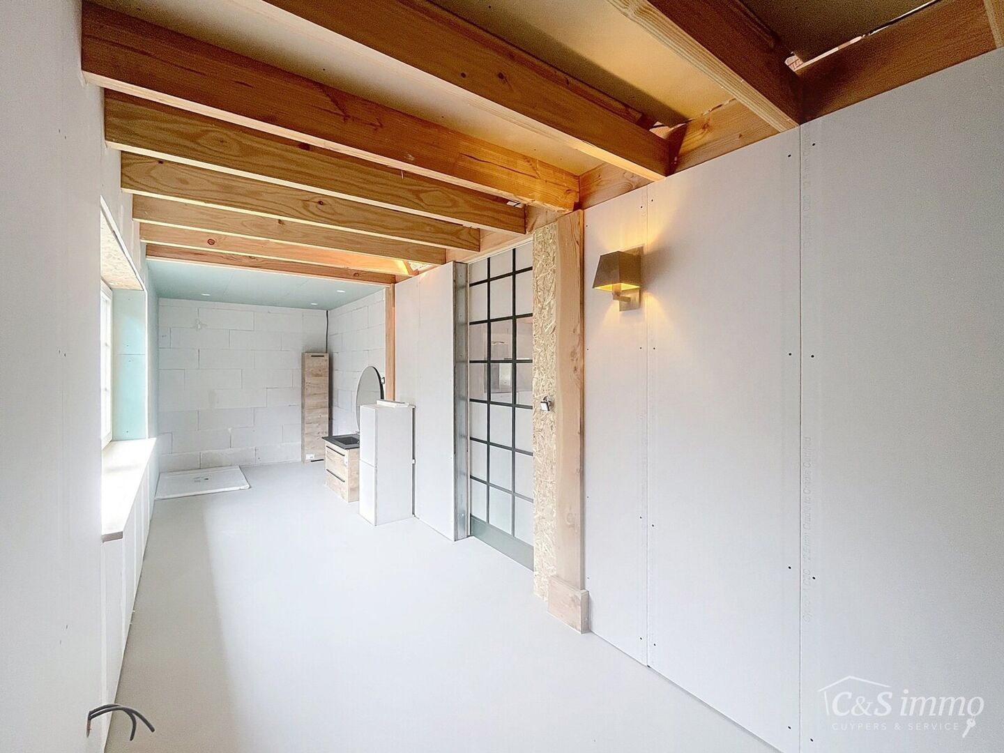 Via een servitude bereikt u het achterliggende, luxueus afgewerkte magazijn met een bebouwde oppervlakte van maar liefst 180 m². Dit veelzijdige pand beschikt over een duurzame gietvloer, twee automatische poorten en vernieuwde elektriciteit. Daarboven bevindt zich een extra verdieping van 100 m², ingericht als stijlvolle loft met nieuwe beglazing en een volledig nieuw, geïsoleerd dak.