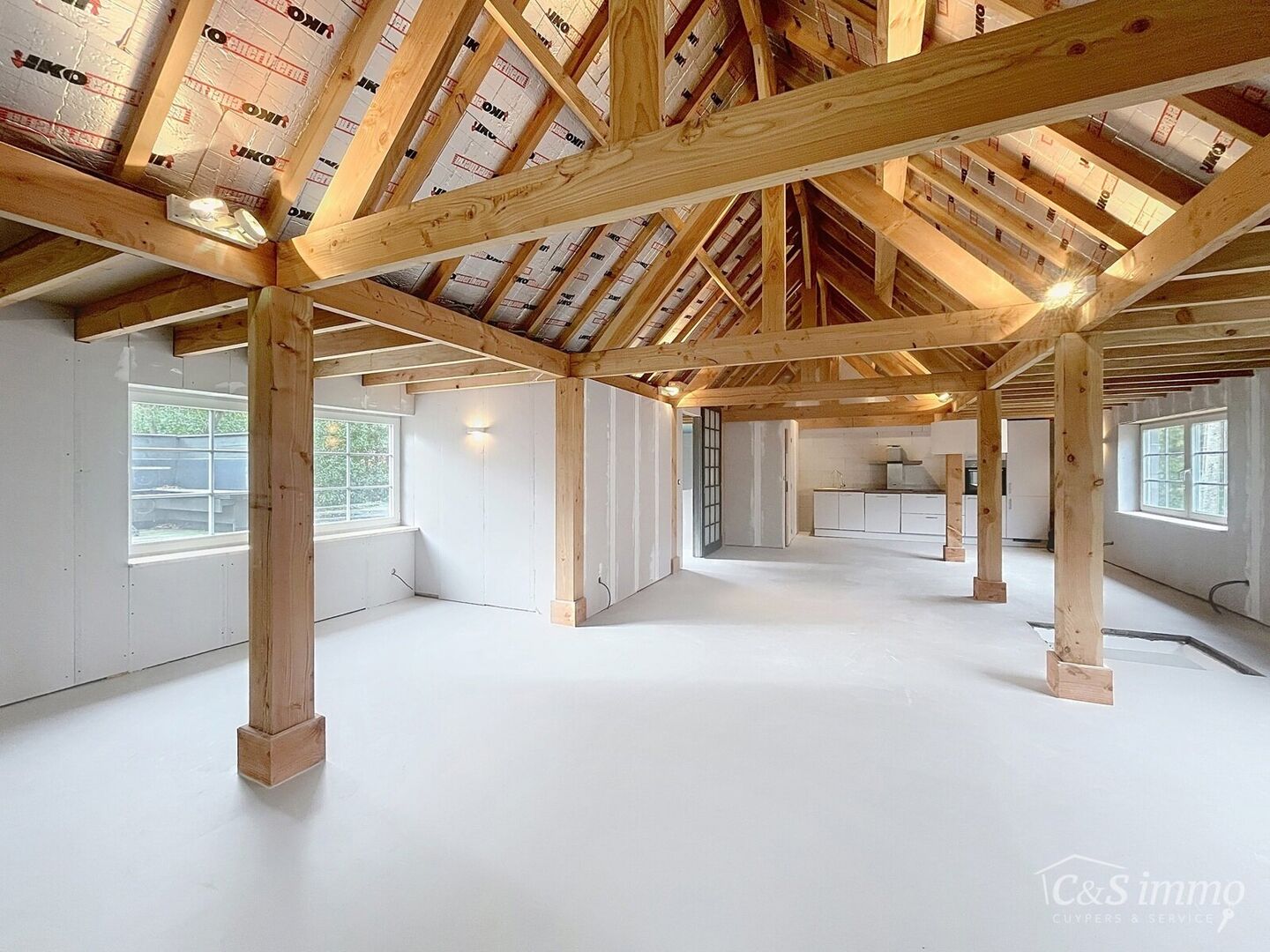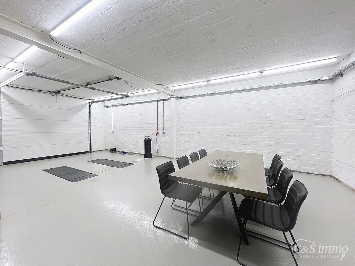Via een servitude bereikt u het achterliggende, luxueus afgewerkte magazijn met een bebouwde oppervlakte van maar liefst 180 m². Dit veelzijdige pand beschikt over een duurzame gietvloer, twee automatische poorten en vernieuwde elektriciteit. Daarboven bevindt zich een extra verdieping van 100 m², ingericht als stijlvolle loft met nieuwe beglazing en een volledig nieuw, geïsoleerd dak.