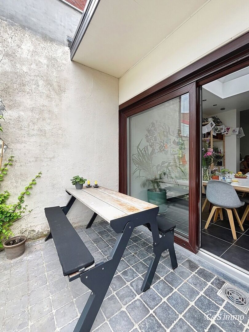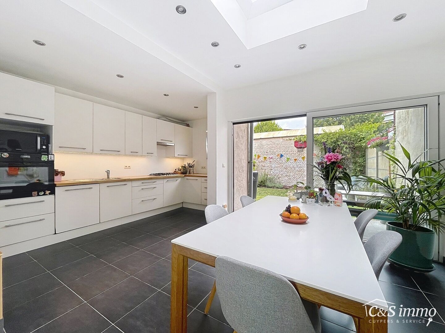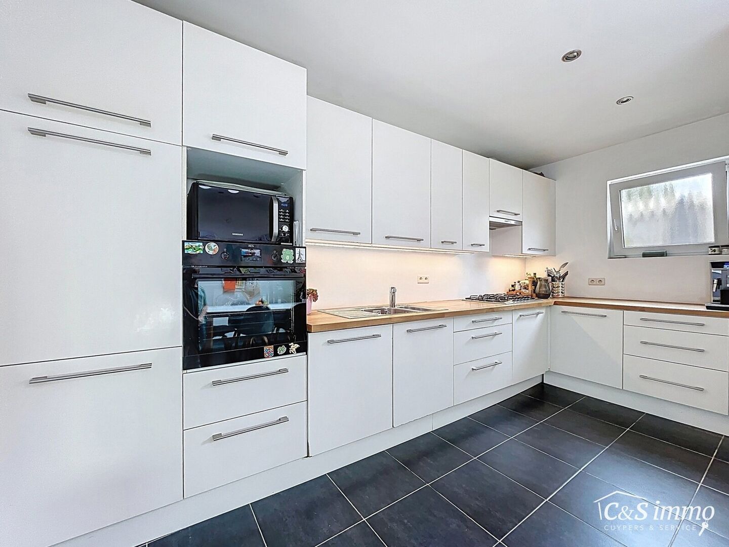 De ruime leefkeuken (ca. 24 m²) is volledig uitgerust met gasfornuis, dampkap, oven, microgolf, koelkast met vriezer en vaatwasser. Dankzij de grote schuifraam loopt de keuken naadloos over in het terras en de gezellige stadstuin. Zowel vanuit de keuken als de woonkamer geniet je van een rustgevend zicht op de tuin.