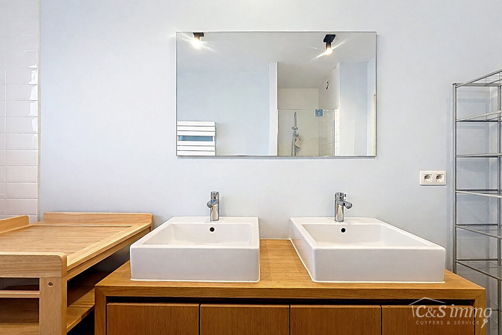 De lichtrijke leefruimte met open keuken vormt het hart van de woning en geniet dankzij de grote raampartijen van een mooi zicht op de aangename tuin. De moderne, volledig uitgeruste keuken beschikt over een kookplaat met dampkap, oven, koelkast met vriesvak en een vaatwasser.