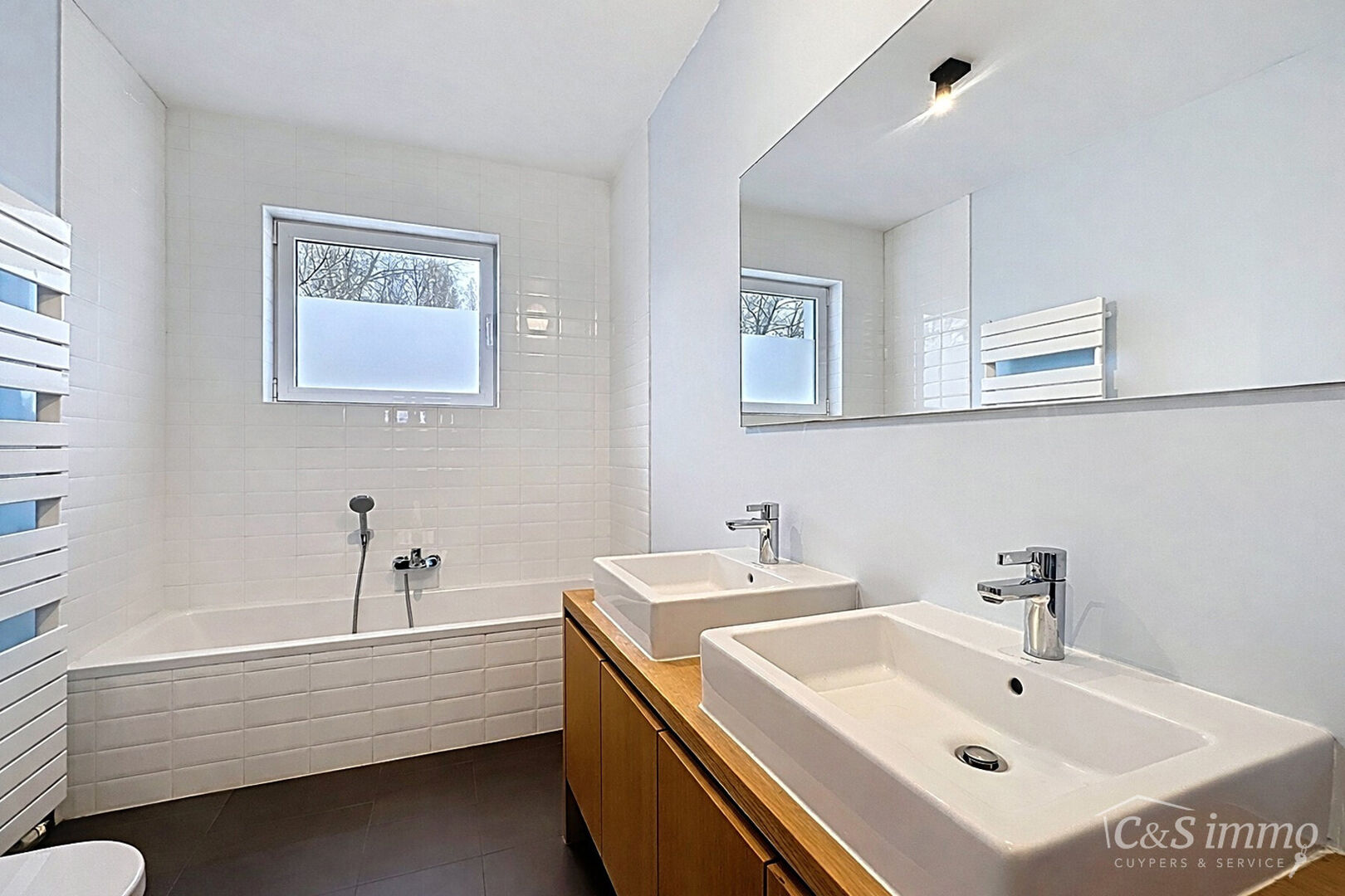 De lichtrijke leefruimte met open keuken vormt het hart van de woning en geniet dankzij de grote raampartijen van een mooi zicht op de aangename tuin. De moderne, volledig uitgeruste keuken beschikt over een kookplaat met dampkap, oven, koelkast met vriesvak en een vaatwasser.