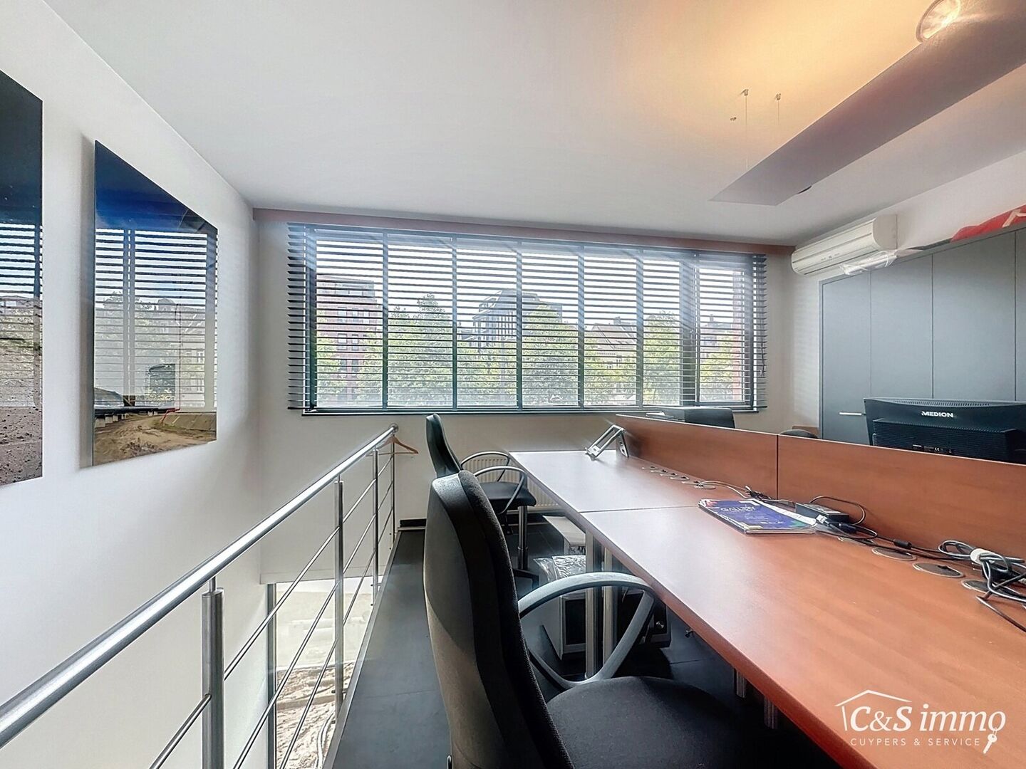 Bij binnenkomst vindt u een ontvangstruimte met toegang tot de trap naar de mezzanine. Op het gelijkvloers is er verder nog een vergaderruimte van 16 m², een apart toilet en een grote etalage die zorgt voor optimale zichtbaarheid en veel natuurlijke lichtinval. Achteraan geniet u van een aangenaam uitzicht op de mooie binnenplaats, wat een rustige werksfeer creëert in het hart van de stad. De mezzanine (27 m²) is uitgerust met een kitchenette en een tweede toilet. De nutsvoorzieningen zijn apart.