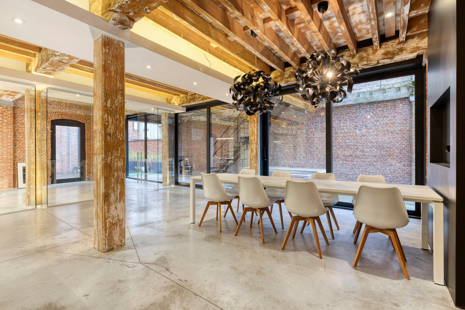 De afwerking is tot in de kleinste details verzorgd en biedt alle hedendaags comfort. Gepolierde betonvloeren, grote glaspartijen en authentieke houten balkstructuren zorgen samen voor een uitgesproken karaktervol en industrieel geheel. Bovendien is de volledige ruimte uitgerust met hoogwaardig ingebouwd maatwerk.