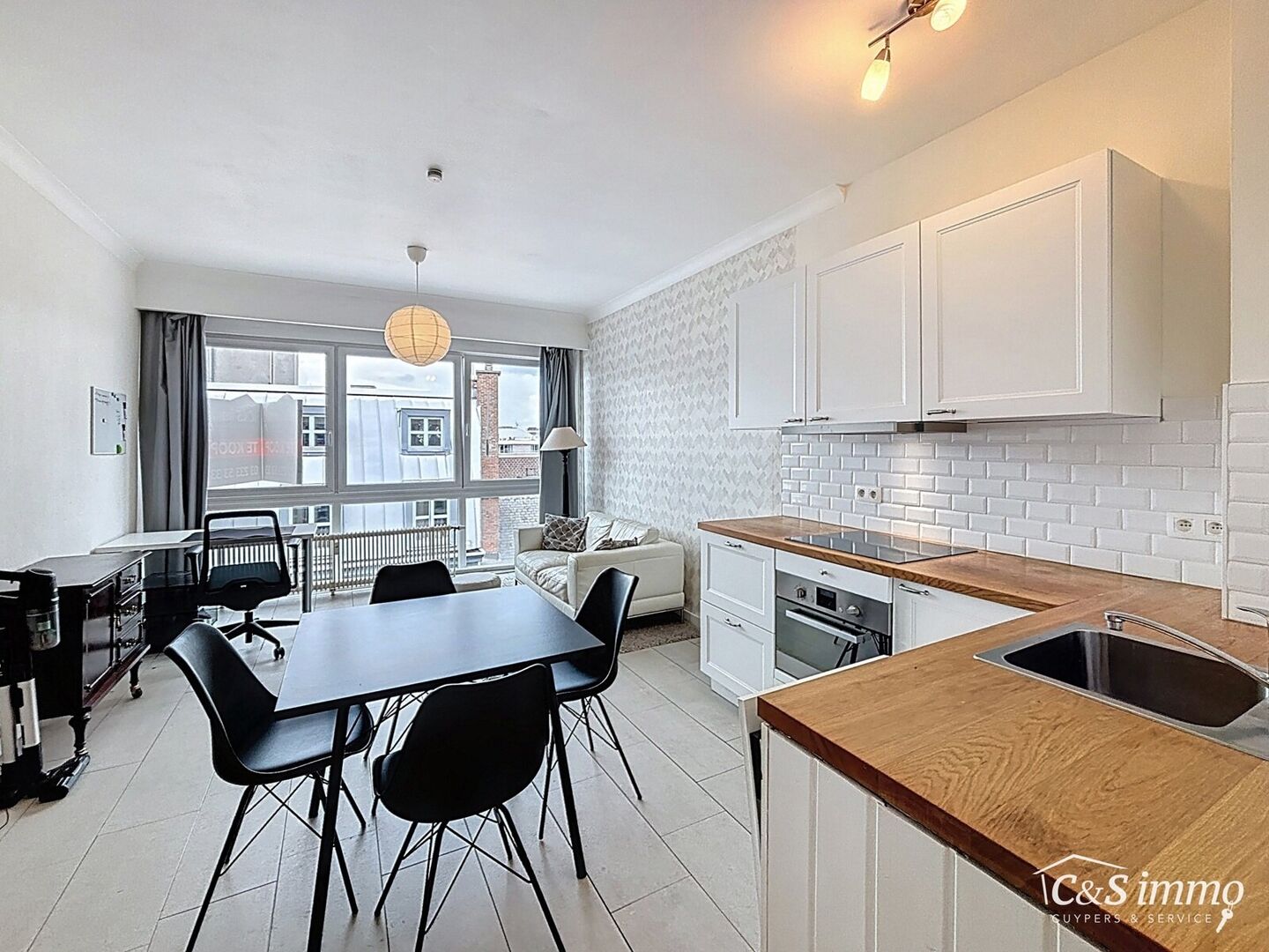 Bij binnenkomst komt u in de inkomhal, uitgerust met stijlvolle houten inbouwkasten. De leefruimte geniet van veel natuurlijk licht dankzij de grote raampartijen met prachtig uitzicht over de stad en de Stadsschouwburg. De open keuken is volledig uitgerust met een inductiekookplaat, combi-oven, vaatwasser en een elegant houten werkblad.