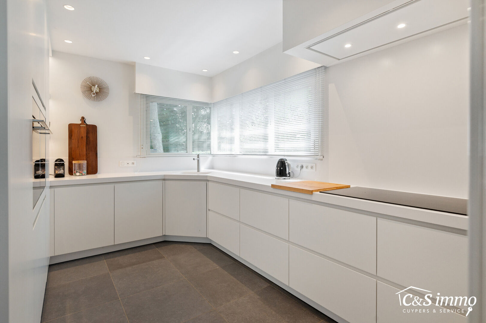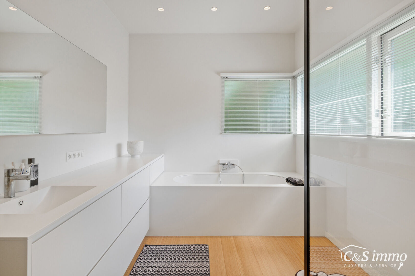 De entree maakt meteen indruk: een ronde inkomhal met vide, waar het daglicht via een dakraam prachtig naar binnen valt. Vanuit deze hal bereikt u een riante woonkamer die naadloos aansluit op een gezellige tv-kamer. Verder zijn er een afzonderlijk bureel, een aparte eetkamer met toegang tot het overdekte terras én een volledig ingerichte keuken die eveneens rechtstreeks vanuit de eetkamer toegankelijk is.