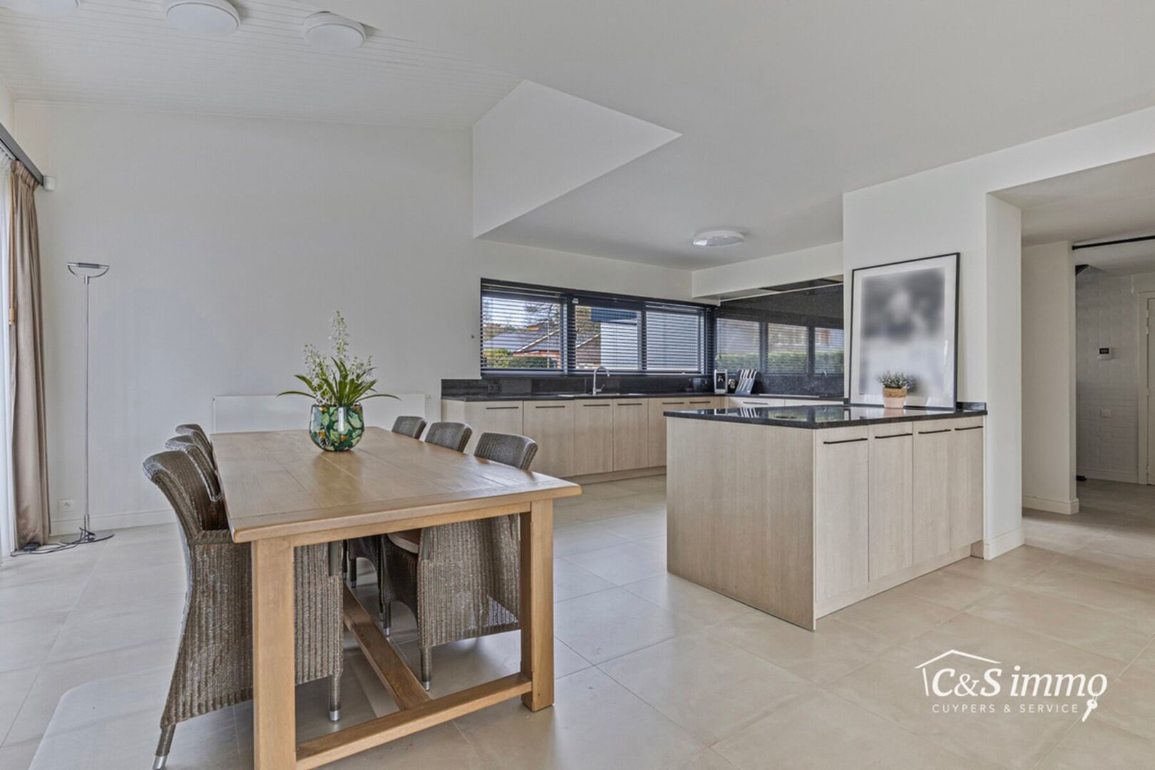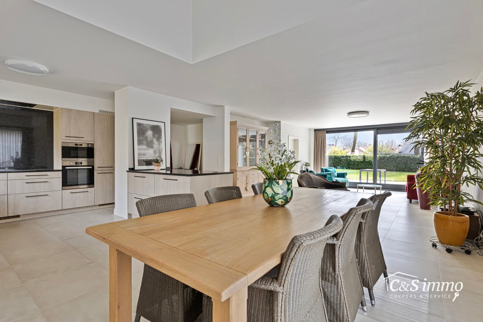 In een rustige, residentiële wijk op een prachtig zuidoostgericht perceel van maar liefst 1.033 m², vinden we deze stijlvolle en lichtrijke villa met een bewoonbare oppervlakte van 275m². De woning werd met oog voor detail en energiezuinig vernieuwd in 2020 en combineert stijlvol wonen met de mogelijkheid tot werken aan huis. De leefruimtes op het gelijkvloers baden in natuurlijk licht dankzij grote raampartijen die je voortdurend laten genieten van het uitzicht op de aangelegde tuin.