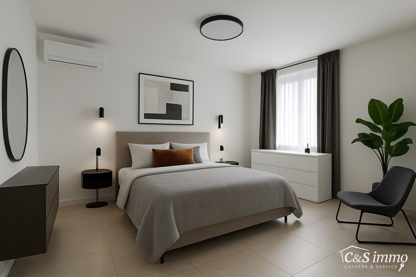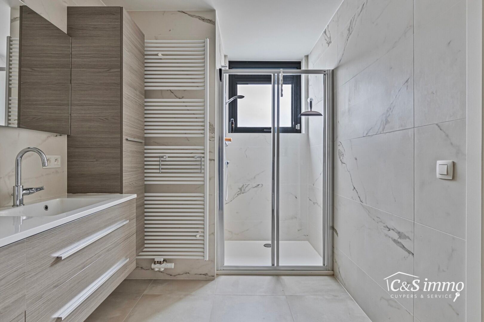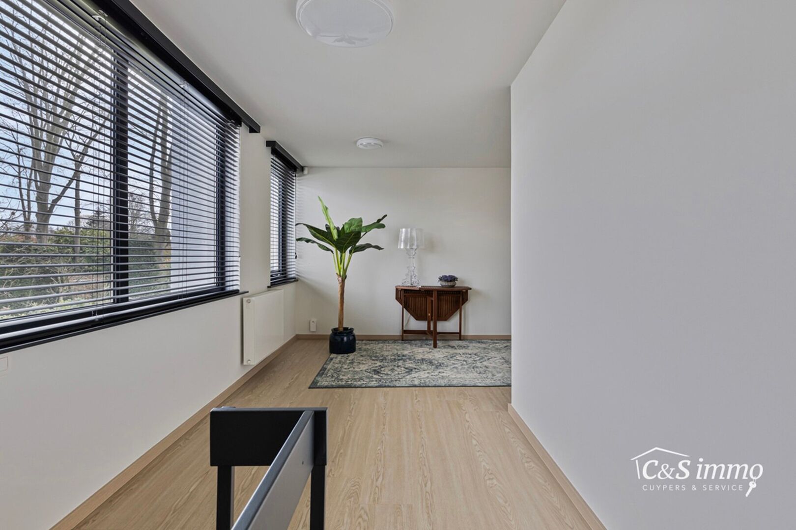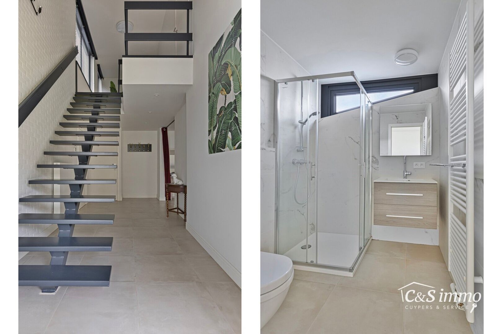 De bovenverdieping verwelkomt je met een charmante, open nachthal, ideaal als thuiskantoor of leeshoek. Twee ruime slaapkamers (ca. 23 m² - 22 m²). Een tweede, ingerichte badkamer met inloopdouche, badkamermeubel en toilet in marmerlook. Aparte berging. De villa beschikt over een groot zuidelijk georiënteerde terras, met 2 zithoeken met volledige privacy.